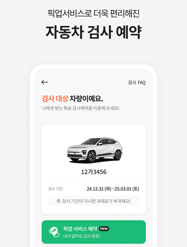 자동차 검사의 정기/종합 검사기간을 자동 조회하고, 알림을 받을 수 있습니다. 휘슬에서 직접 검사소 예약을 진행하면 대기 없이 검사를 받을 수 있고, 위치 기반으로 주변 친절 검사소를 안내해줍니다. 정기검사를 놓치는 일이 없도록 미리 알림을 받아 자동차 관리의 기본을 지킬 수 있도록 돕습니다.